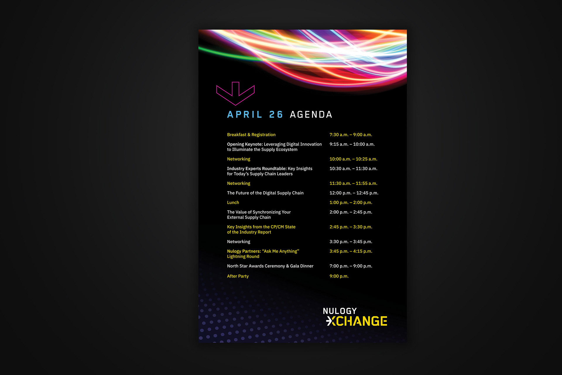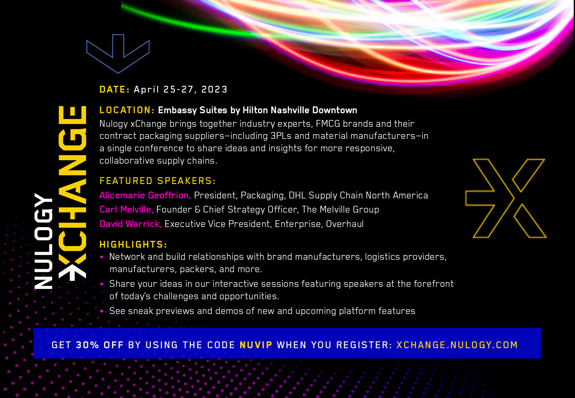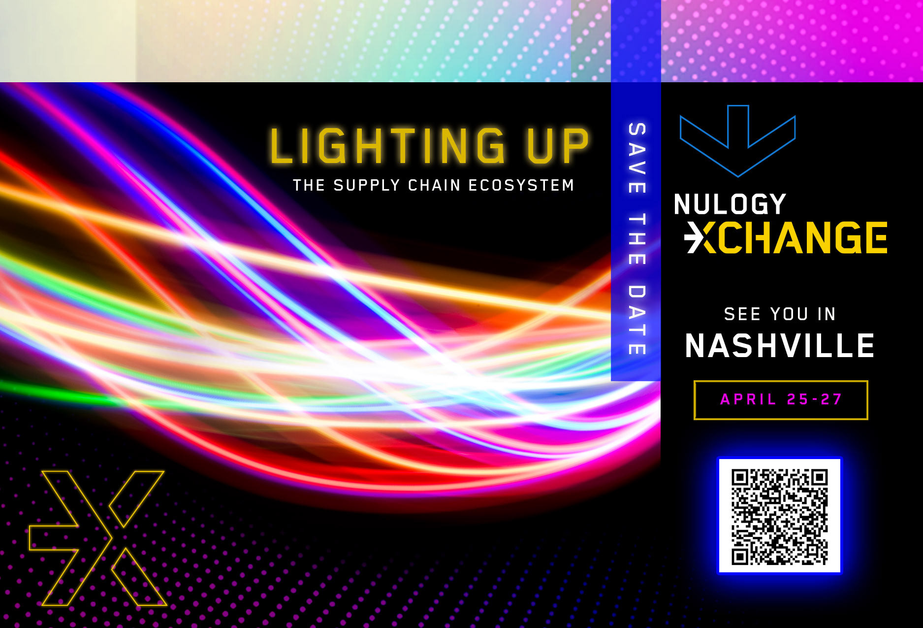 Provided art direction and design for the xChange Supply Chain Conference sponsored by Nulogy. The theme and visual style was inspired by the lights, music and energy of Nashville.